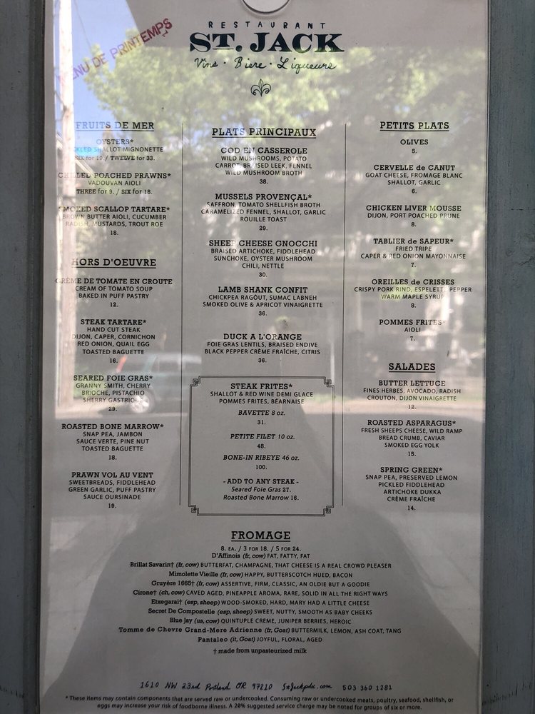 St. Jack, a French seafood restaurant located in Portland, offers a wide range of options for its customers. With a focus on French cuisine and a strong emphasis on seafood dishes, St. Jack stands out as a romantic and classy dining spot. The menu boasts many vegetarian options, making it suitable for a diverse range of diners. Customers praise the wine selection, highlighted by both French and local regional choices. The dishes at St. Jack, such as Canard and Steak Frites, receive high praise for their quality and presentation. Desserts like the Mango Pavlova and Madeleines are recommended by patrons. While some reviewers mention minor issues with service and consistency, the overall dining experience at St. Jack seems to leave a positive impression on customers, making it a promising destination for a special dinner or date night.